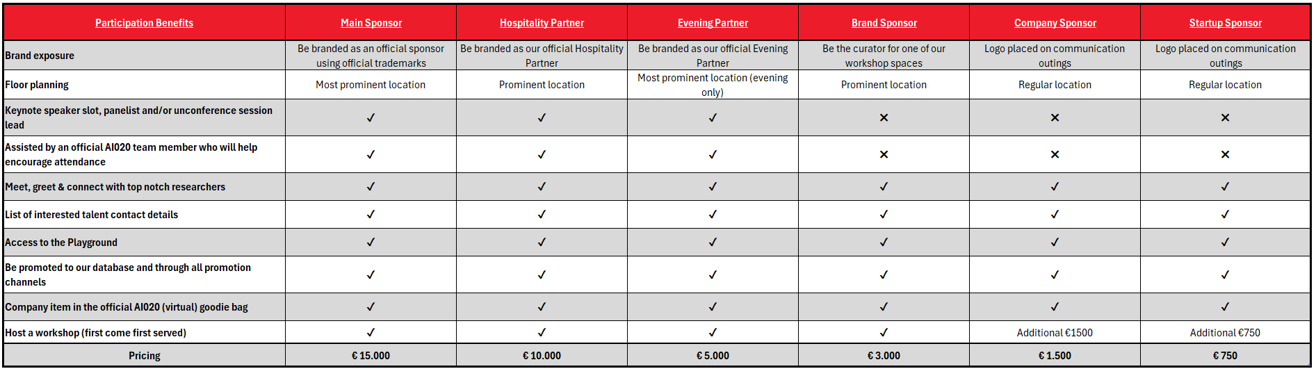 Step into AI020 as a sponsor, speaker, workshop host, startup, or company and place your ideas at the heart of the AI movement. Share your expertise, connect with forward-thinking innovators, and build relationships that have the power to shape the future of artificial intelligence.